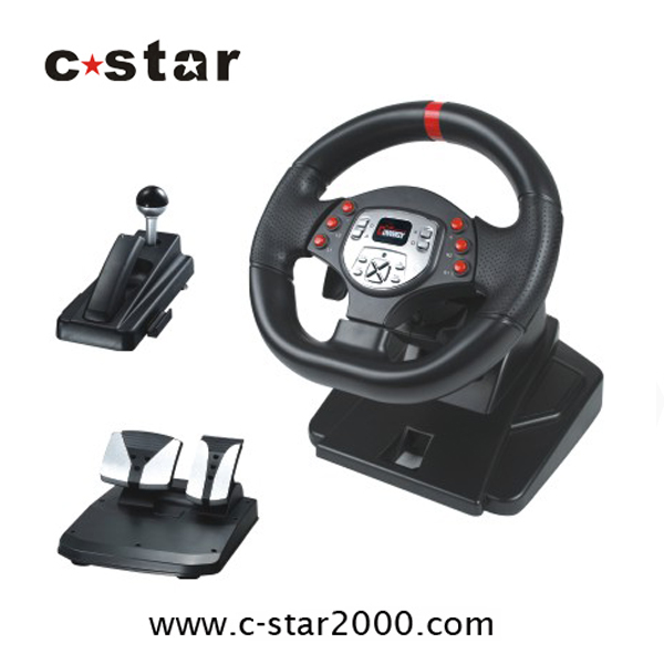 video game steering wheel for PS2/PS3/USB. Programmable analog gas and brake pedal. Adjustable title angle. Interactive vibration with games. Traction control....Details